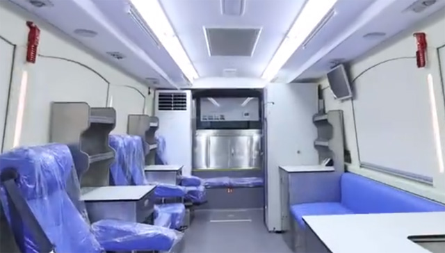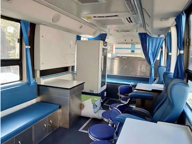 配置鋰電池系統(tǒng)的9米長的采血車,取消了傳統(tǒng)發(fā)動機(jī)的供電用鋰電池完全代替??梢詽M足一天8小時的采血工作需求,鋰電池放置在下面的行李艙里面。后面這個就是整個的一個電池塊。大概有60度的電。內(nèi)飾進(jìn)行了升級,包括它的風(fēng)道,頂棚,包層柱都做了一個商務(wù)改造。車廂的布局符合獻(xiàn)血流程。采血區(qū)域一共有四個采血位,可以四個人同時采血。旁邊是登記跟初篩的工作臺。負(fù)責(zé)給采血的人進(jìn)行登記。檢測血型,做簡單的初篩。