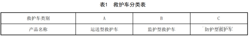 按產(chǎn)品功能和用途,將救護(hù)車分為3類,分類見表1。