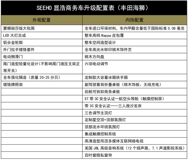 在內(nèi)飾設(shè)計(jì)上改裝商務(wù)車豐田海獅注重簡約與大氣的完美結(jié)合,在展示商務(wù)車本身尊貴與大氣的同時(shí),也將帶來不一樣的旅行體驗(yàn)。