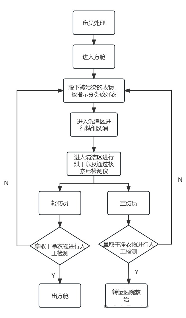 傷員處理->進(jìn)入核化污染洗消車(chē)->脫下被污染的全身衣物->按分類放好衣服物品->在洗消區(qū)進(jìn)行精細(xì)洗消->進(jìn)入清潔區(qū)進(jìn)行烘干跟核污染素檢測(cè)->(輕傷員拿干凈衣服進(jìn)行檢查->出洗消車(chē))->(重傷人員拿干凈衣服進(jìn)行檢查->轉(zhuǎn)運(yùn)到醫(yī)院救治)