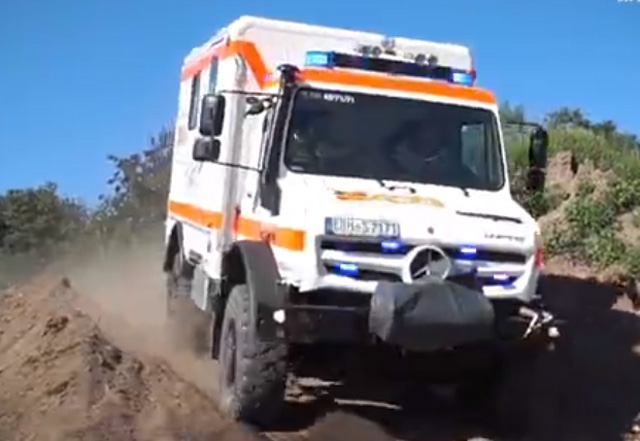 Mercedes Unimog U 4023,德國制造的堅(jiān)固可靠的車輛??梢詾槠h(yuǎn)地區(qū)的人提供醫(yī)療服務(wù),車輛長6米,總重量為10.3噸。配備了自恢復(fù)絞盤輪胎充氣系統(tǒng)。發(fā)動(dòng)機(jī)功率為231馬力,最高時(shí)速是89公里每小時(shí)。可以穿越森林山脈等困難的地形。也可以穿越水深1.2米的區(qū)域。