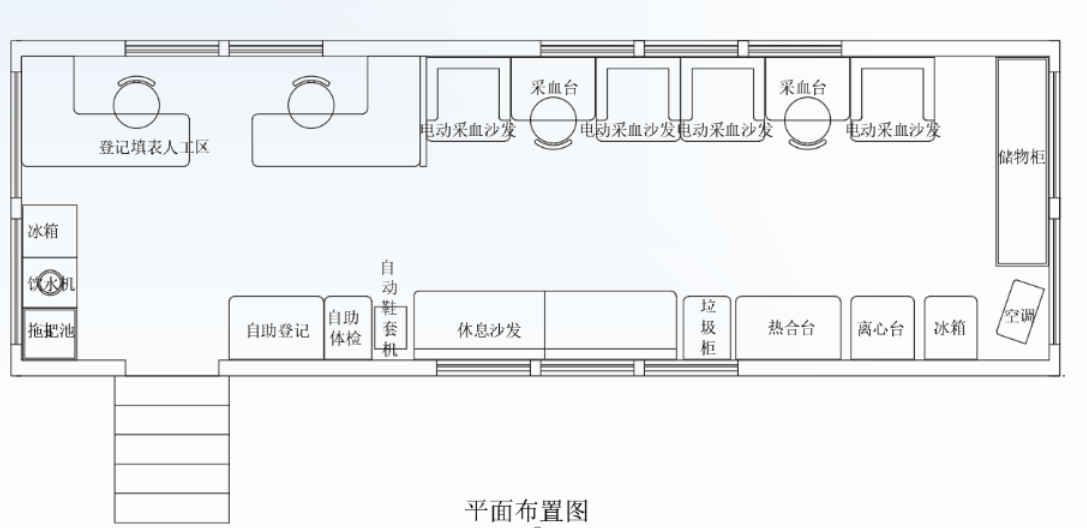 獻(xiàn)血屋由骨架、外蒙鋼板、隔溫層、鋁塑板、中空鋼化玻璃窗、防盜門、底盤、外墻、內(nèi)部裝修、醫(yī)療設(shè)備等結(jié)構(gòu)組成。面積比較大,內(nèi)部設(shè)置嚴(yán)格按照采血流程要求,包括獻(xiàn)血征詢區(qū)、體檢區(qū)、快速檢測區(qū)、獻(xiàn)血等候區(qū)、采血區(qū)、和休息區(qū)。配備的設(shè)備滿足血液儲(chǔ)存,試劑儲(chǔ)存,電子血壓計(jì),血紅蛋白儀,細(xì)胞分離機(jī)等醫(yī)療廢物存放設(shè)施,獻(xiàn)血者可在休息區(qū)觀看電視節(jié)目和進(jìn)行娛樂活動(dòng),是一所現(xiàn)代化的愛心獻(xiàn)血屋。